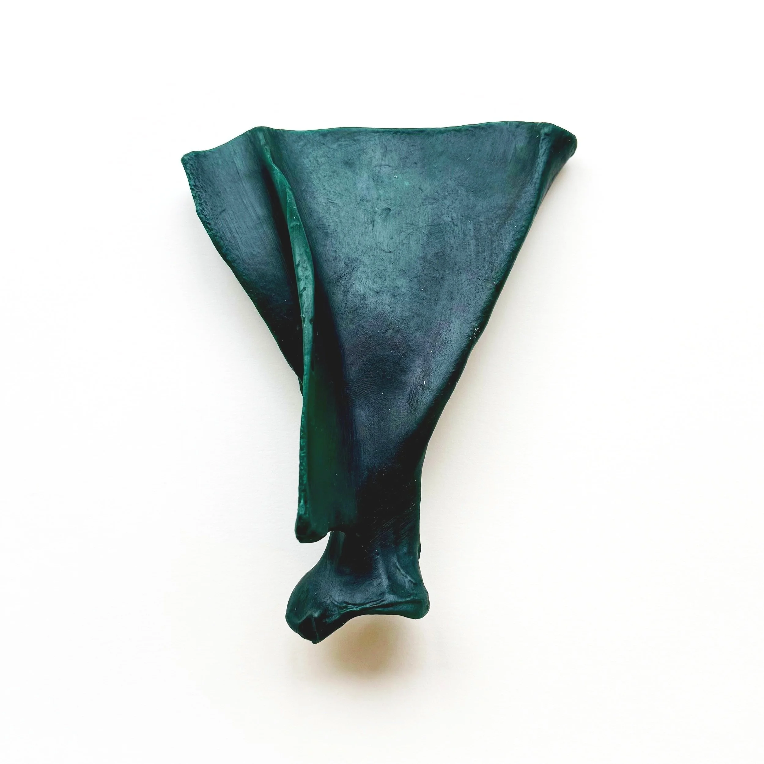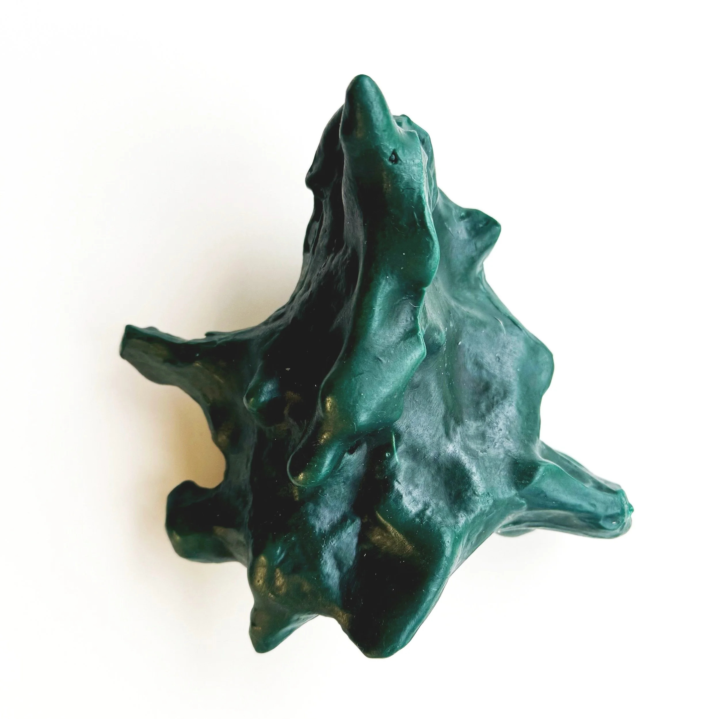 To create each piece, I poured melted wax into the same silicone mould used in my Hagstone series. Before the wax fully set, I opened the mould and immersed it in cold water to preserve its fluid, unfinished shape. Each sculpture emerges uniquely, shaped by the varying pressure and timing of the mould’s release — a process that remains spontaneous, organic, and guided by chance.