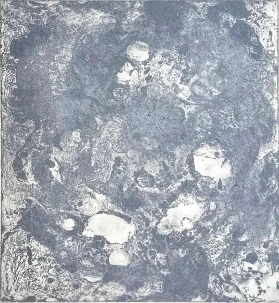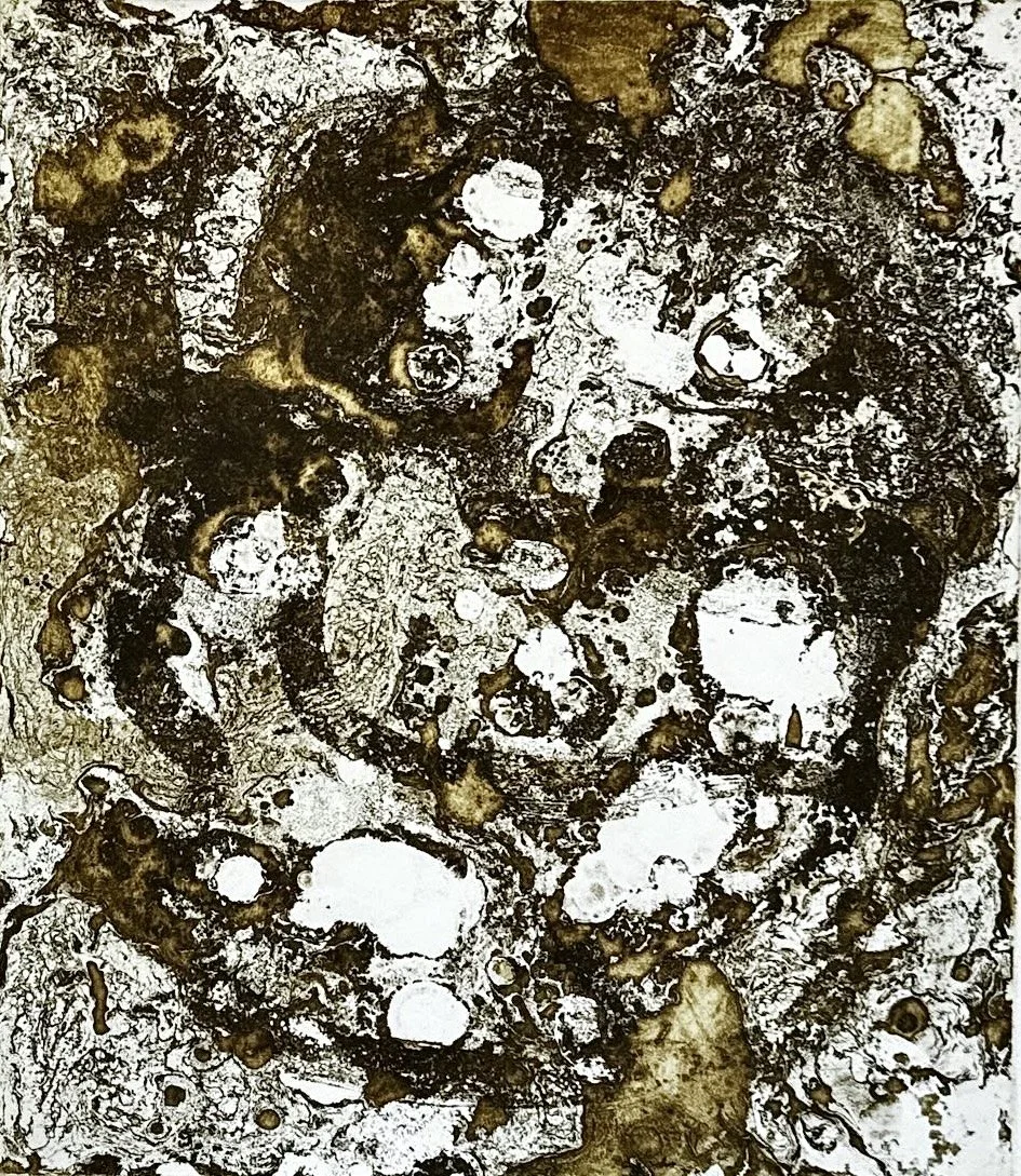 Formation is a continuation of the Primo series. In this work, I etched the plate into an organic shape inspired by the patterns found in Primo. The resulting form resembles an island or a cell, suggesting that life exists within it—and is emerging from it.