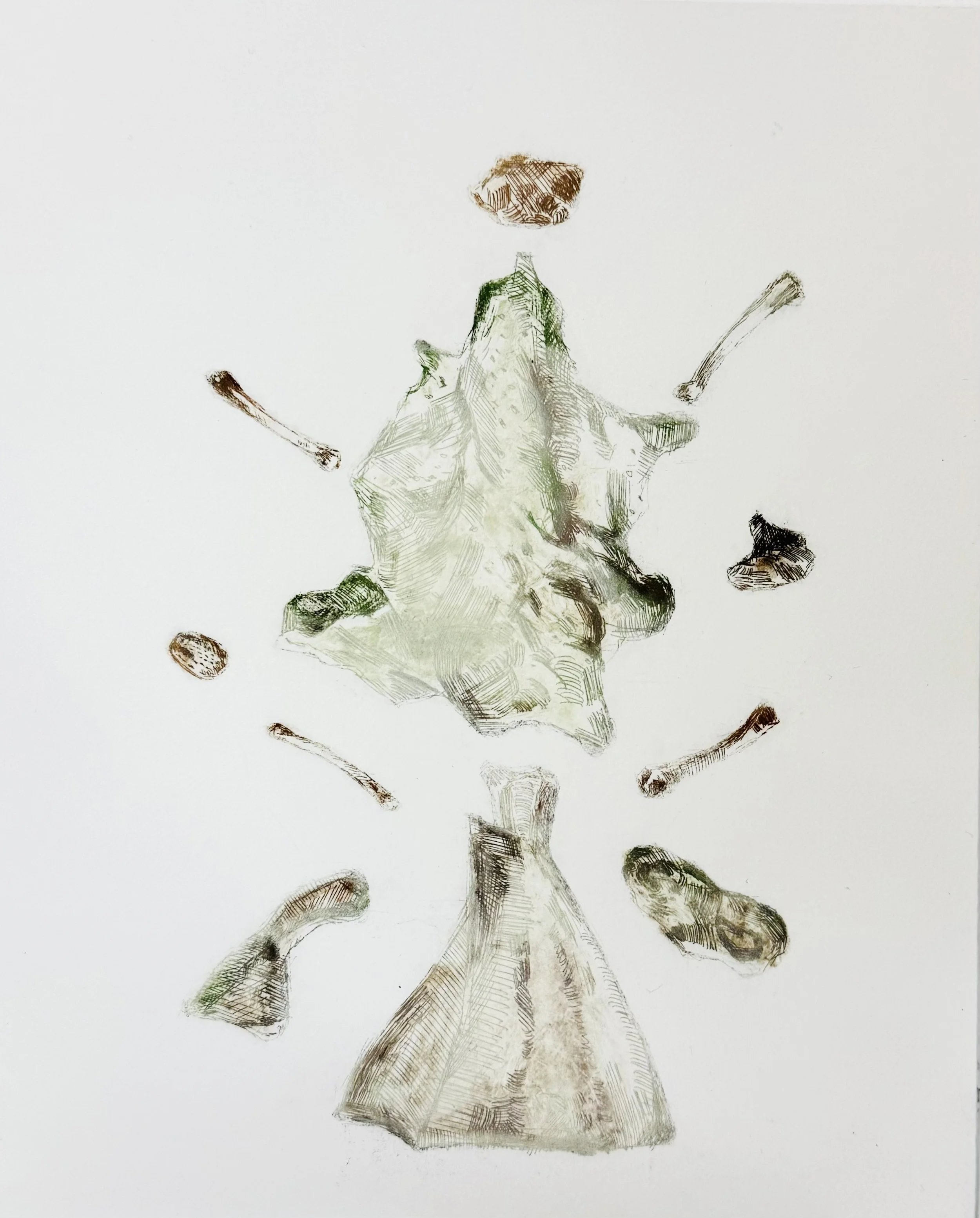 Using white spirit, I drew and created monoprints based on this concept. In the first piece, I drew within the shape of the object, symbolizing how individuals form their own meanings of life or objects. In the second piece, I drew outside the object, emphasizing the role of the environment in shaping our understanding. The third piece focuses on the broader environment and its influence on form and structure.