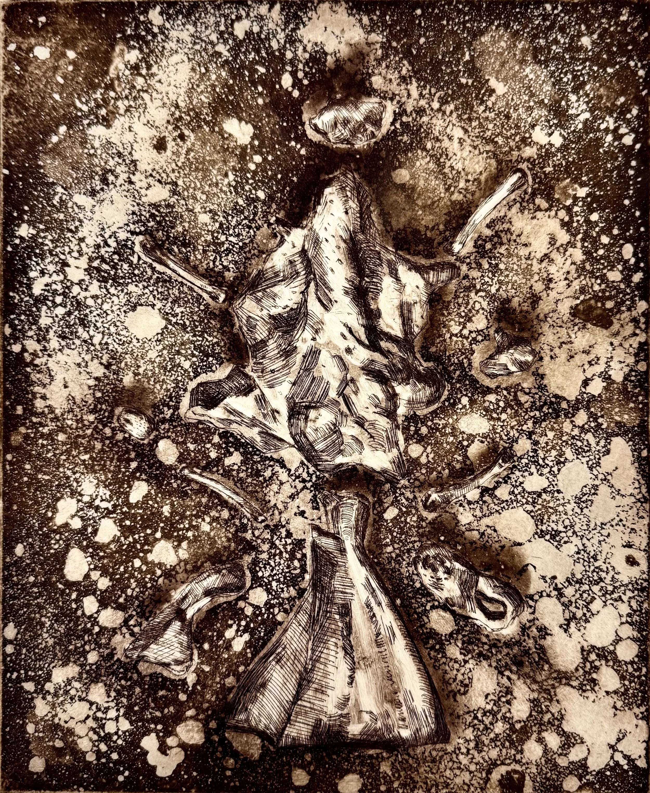 To embody this concept, I dissolved the zinc plate into multiple parts, allowing natural selection to guide the process. I introduced various chemicals—rinds varnish, straw hat, limonene, and methylated spirits—onto the water’s surface, then lifted the plate to capture the organic, unpredictable patterns that emerged. The interaction of these chemicals created fascinating reactions, forming intricate textures and compositions. I then etched the plate, mirroring the randomness and organic nature of life’s beginnings.