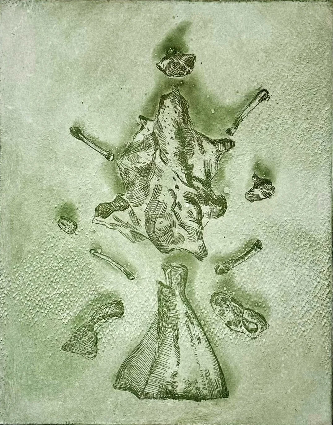Guided by intuition, I arranged the objects and translated these compositions into drawings, which I then etched using aquatint. By experimenting with different etching techniques and textures, I created varied backgrounds that evoke a sense of mystery. The work invites viewers to question the meaning behind these placements, much like how we interpret the enigmatic intentions of our ancestors.
