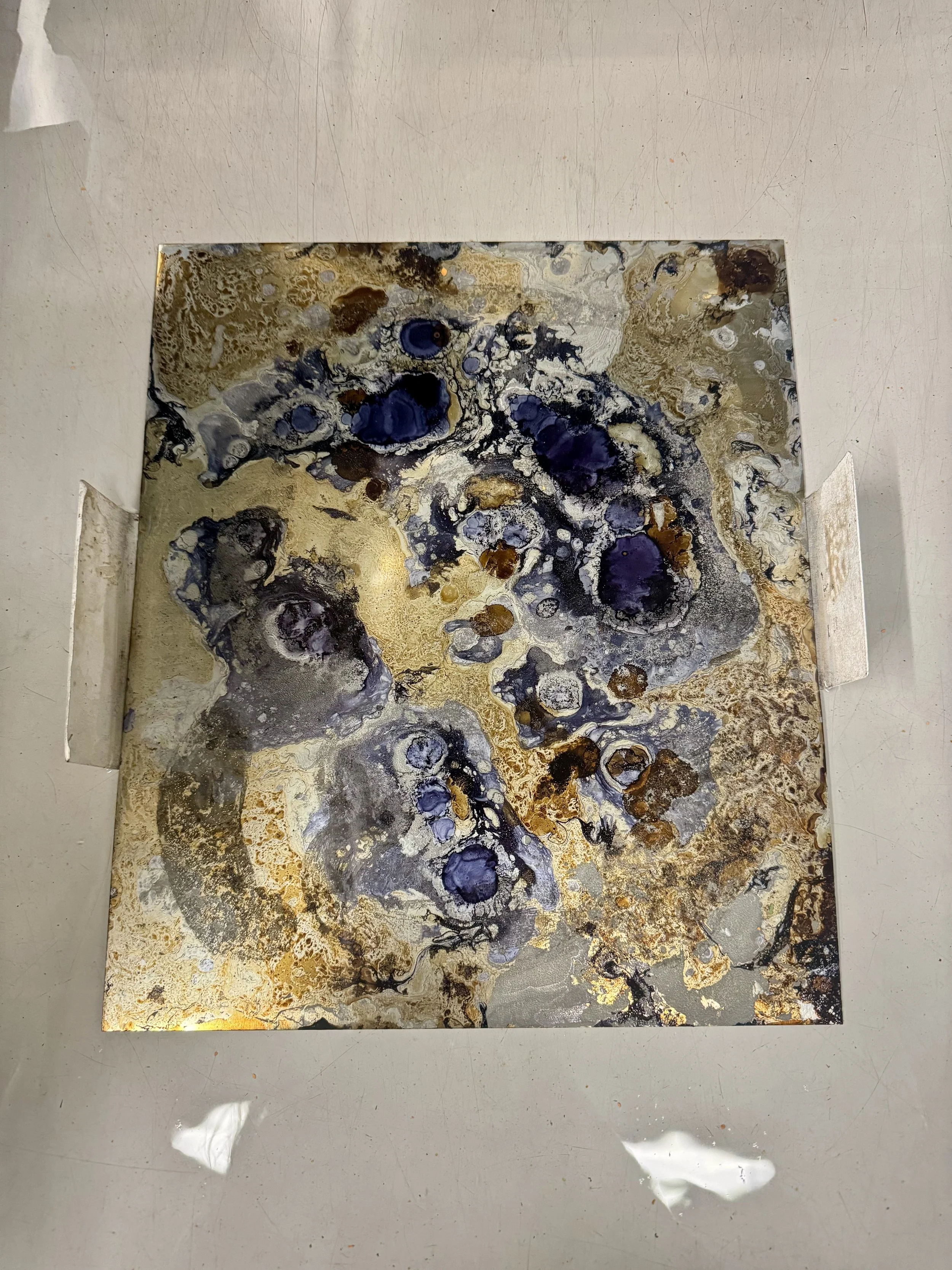 Aldworth’s project Modern Alchemy was especially inspiring. It was a collaboration with Dr. Amanda Jarvis at the University of Edinburgh, whose research focuses on sustainable catalytic chemistry. In this project, Aldworth created a series of experimental works using chemical processes in the laboratory. Dr. Jarvis prepared various chemical mixtures, including Aqua Regia—a powerful acid historically used by alchemists to dissolve gold—to etch Aldworth’s steel plates. The reactions left unexpected white marks that didn’t print conventionally, prompting Aldworth to apply gold leaf to some works as a nod to the alchemical themes. She produced 54 prints from 13 plates in this experimental series. This fusion of the artist’s studio and scientific laboratory as shared sites of experimentation deeply inspired me. It encouraged me to use etching techniques to explore the origins of life and existence, mirroring scientific concepts like cell division through chemical reactions on zinc plates. This series called Primo Series.