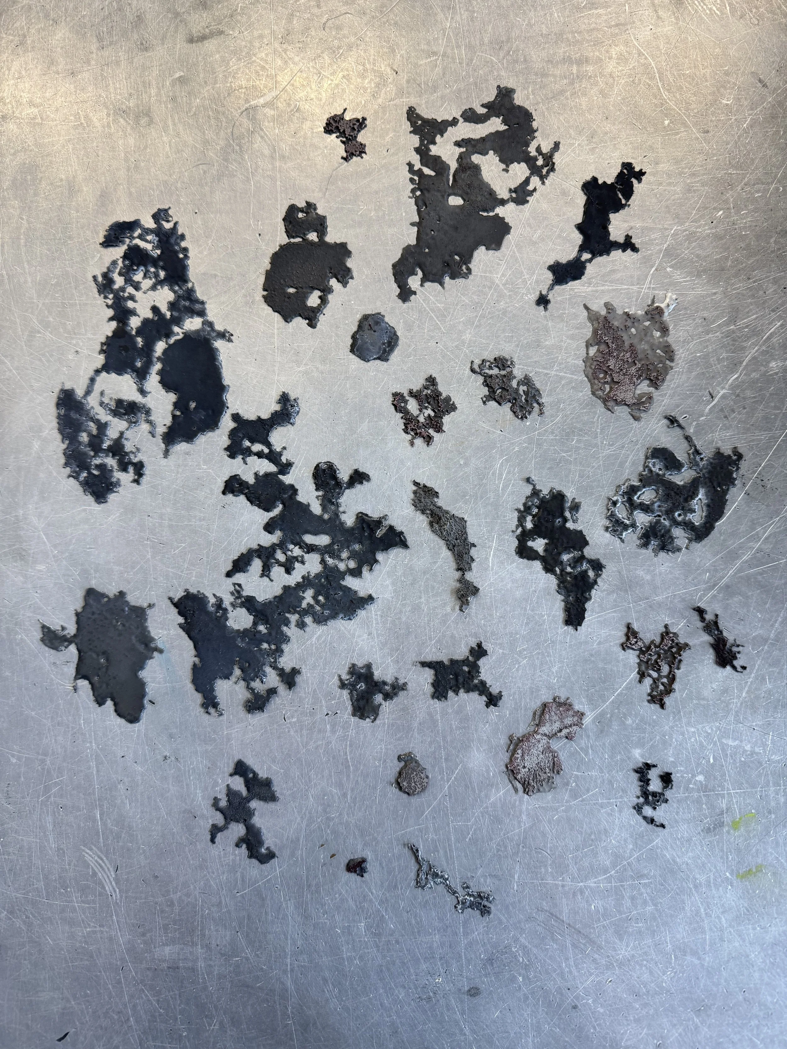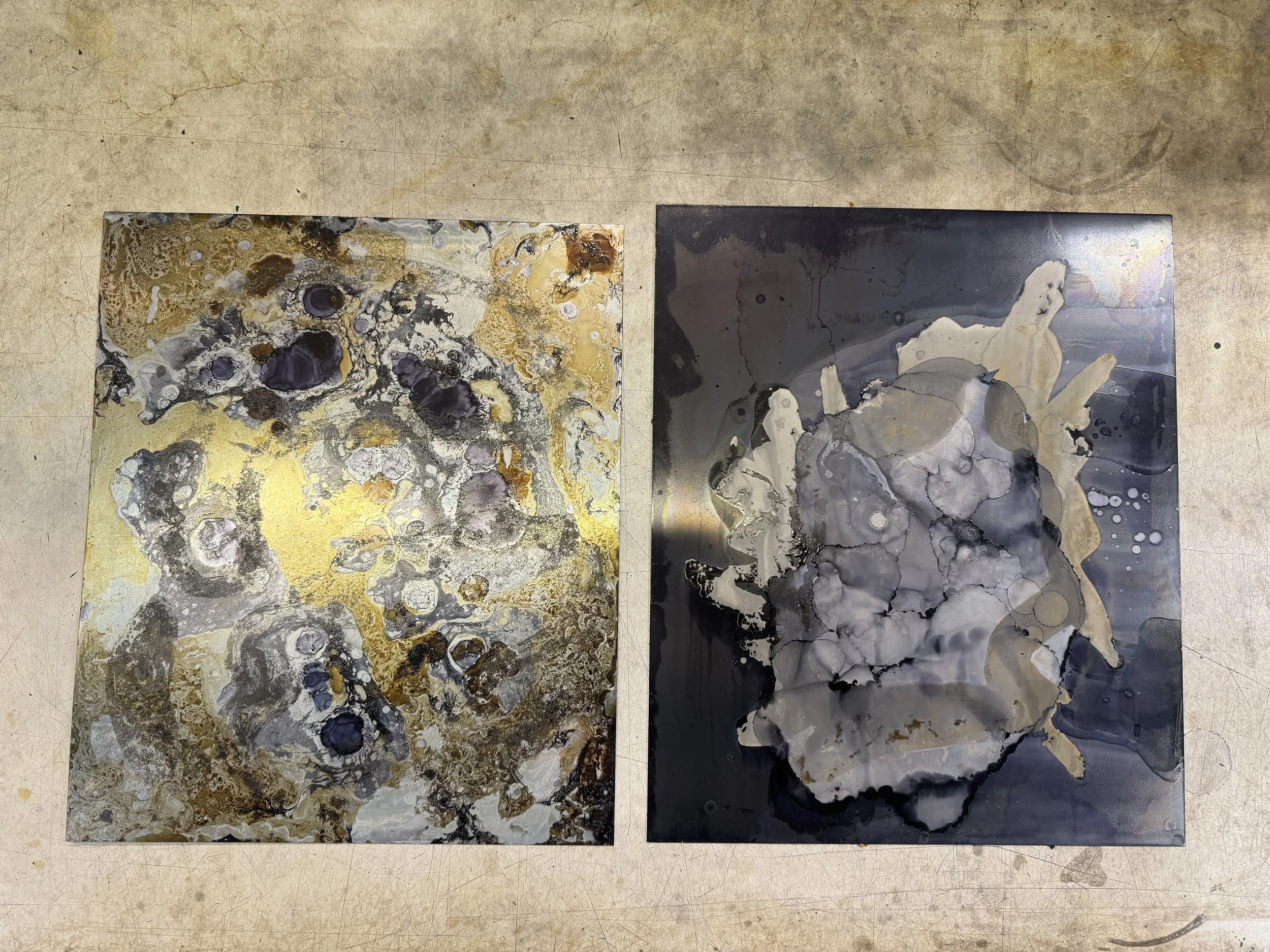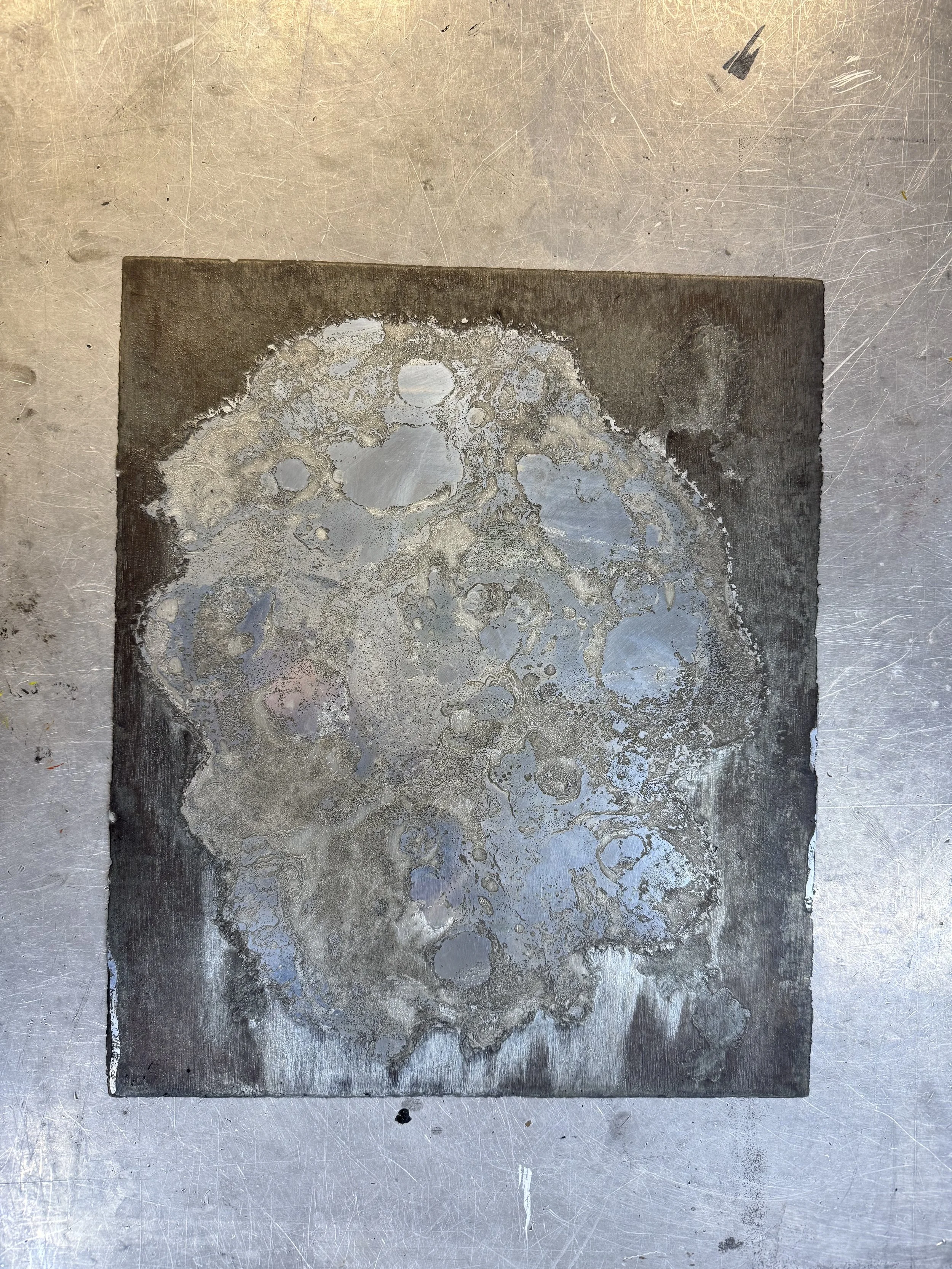 That moment sparked the foundation of my Unit 2 project. I decided to dissolve a zinc plate, letting chance shape its surface over time, much like life itself—unpredictable, shifting, and alive.