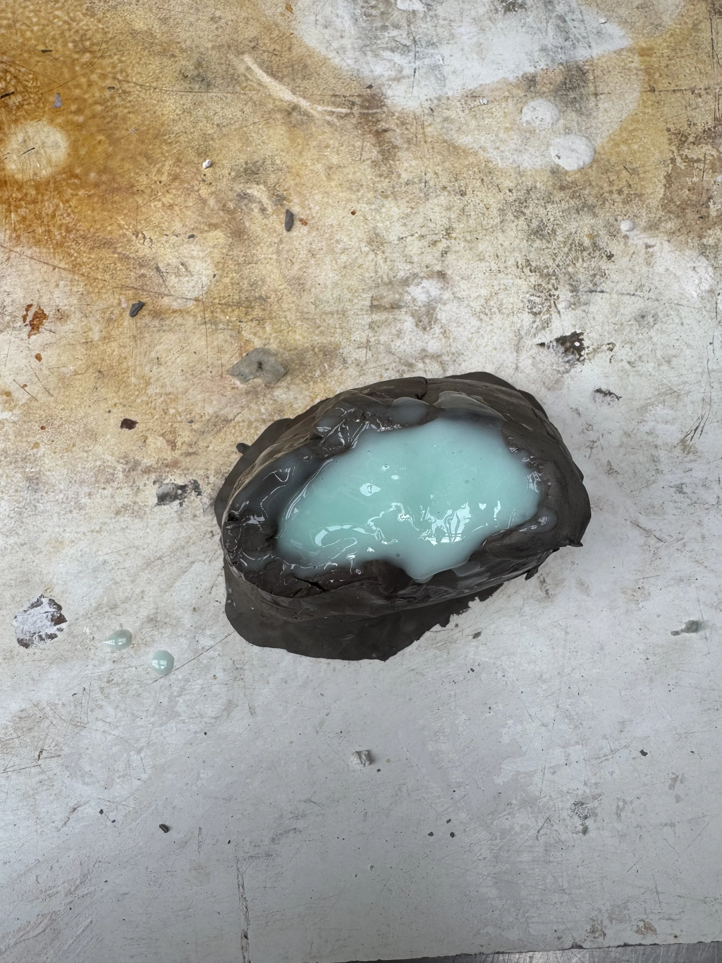 This concept deeply resonated with me. It pushed me to think more consciously about materials and form, and how they can express not just external themes but the experience of being itself. That’s why I began casting a hagstone I found while mud larking, experimenting with different materials as a way to explore the body of existence. This led to an idea: what if I let life happen on a zinc plate—allowing chance, time, and transformation to take over?