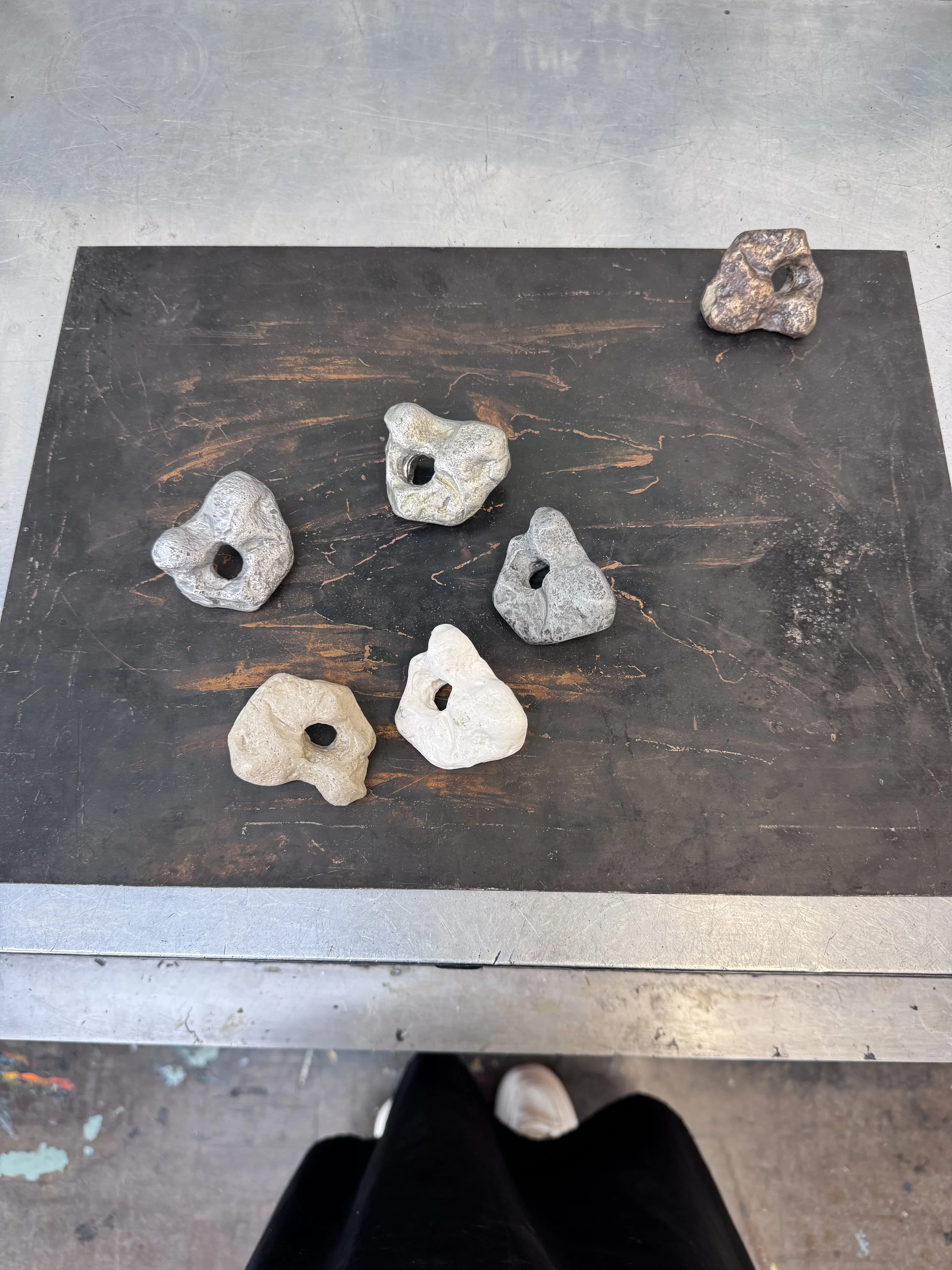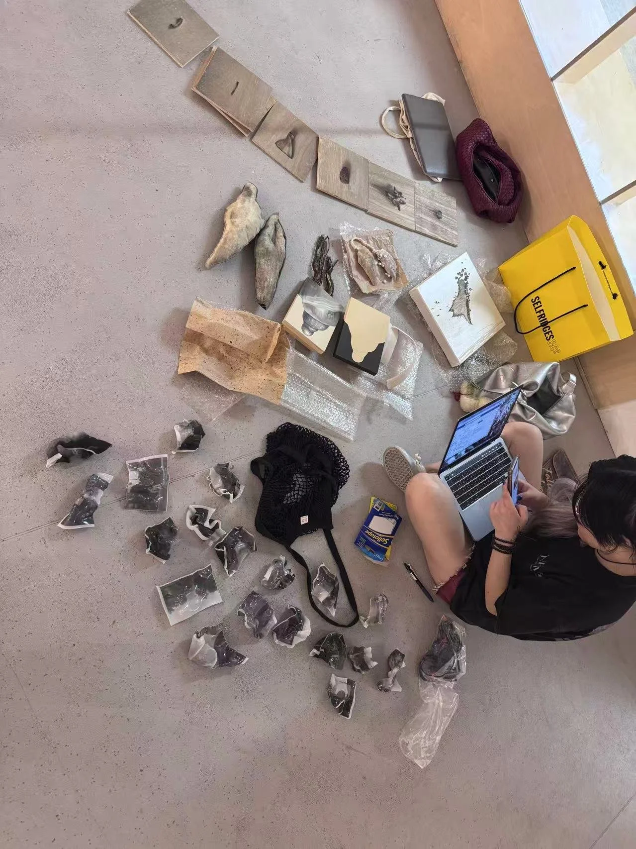 I also spent time considering how to arrange my sculptures and prints. Initially, I planned to display them separately, but I later realised that they needed to engage in a dialogue with one another. Therefore, I decided to present them together. Additionally, I experimented with how to show my film—whether to project it on the wall or play it on a screen. I ultimately chose to use a screen, as it provided a darker, more mysterious background and helped reduce the sense of technological interference in the atmosphere of the work.